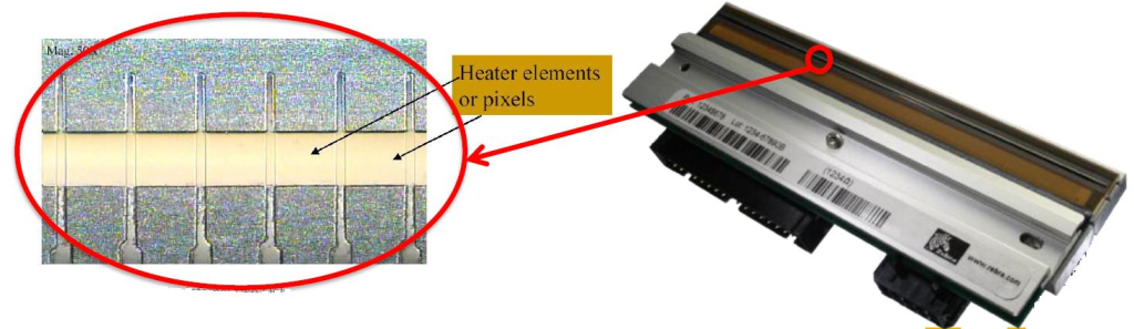 • 热能打印头有电阻抗元件线性排列而成;这些电阻抗元件在热能打印机中产生出点状热能